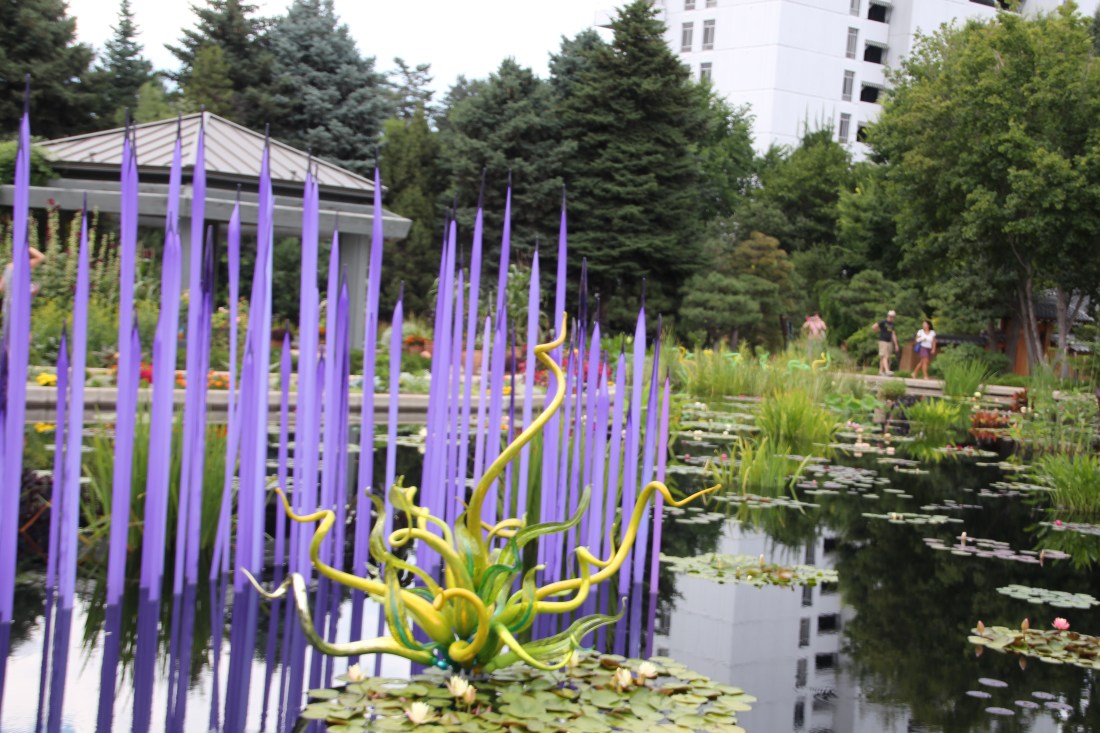 I took this photograph at the Denver Botanical Gardens in the summer of 2014. The subject was a beautiful glass design created by artist Dale Chihuly and it shared the surrounding water with live fish and lilies. There were also a great number of pieces that were on dry ground throughout the gardens. It was amazing to think of the ambition and orchestration of such a massive and breathtaking exhibit!